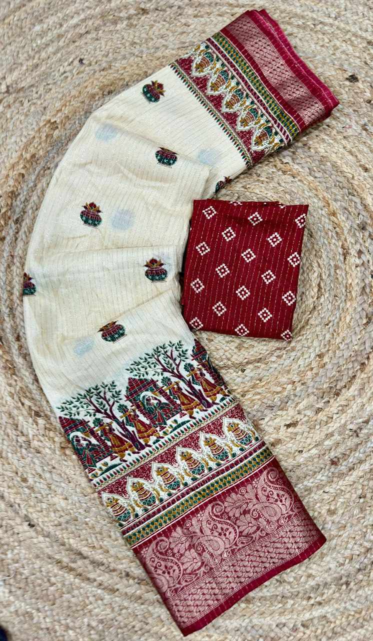 A timeless piece featuring beautiful zari weaving with subtle lining design, giving a royal and graceful appearance. Perfect for festive occasions, traditional events, and family functions.
