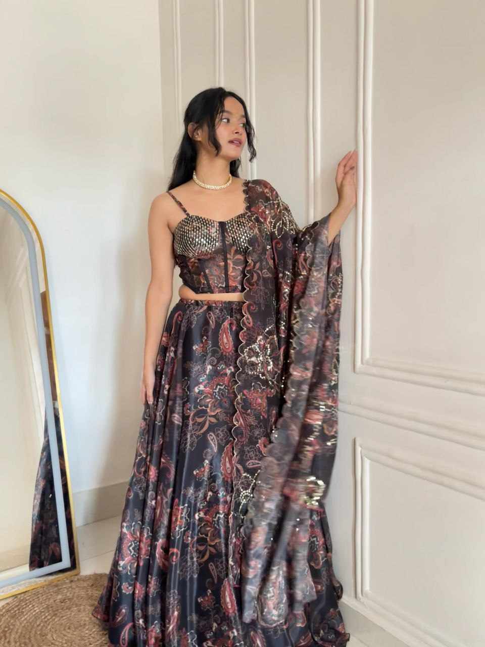 Lehenga – Pure Jimmy Organza digital printed lehenga with a grand 8-meter flair. Comes with canvas patta, can-can, and adjustable waist dori for a perfect fit